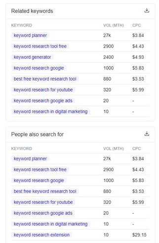 The tool also gives you a bunch of related searches that are being searched on Google, along with their monthly searches and CPC.