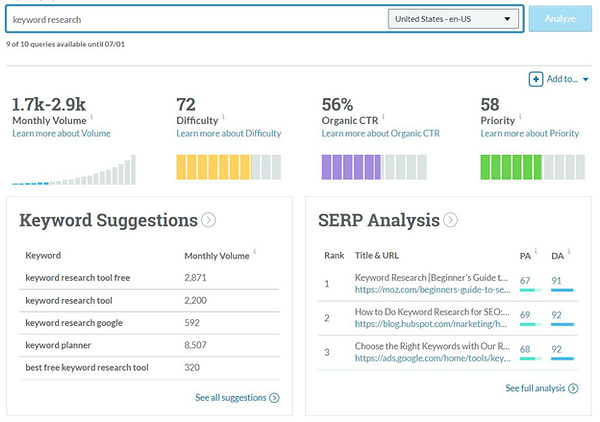 Moz SERP analysis tells you a lot about the blog posts or web pages ranking on the first page for your target search term.
