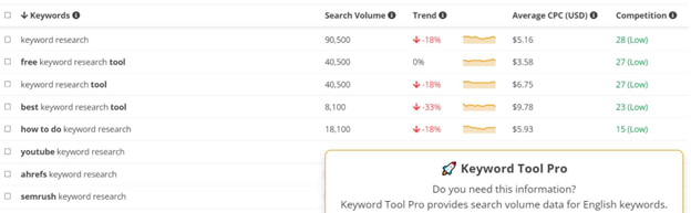 So, if that’s not enough for your keyword research needs, you’d have to upgrade to the pro plan, which, by the way, isn’t expensive either.